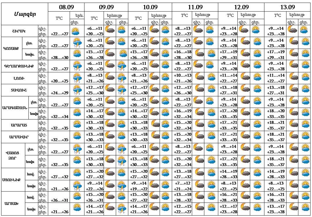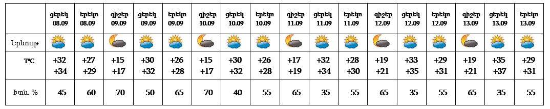 Հանրապետության տարածքում՝ սեպտեմբերի 8-9-ի կեսօրից հետո առանձին շրջաններում սպասվում է կարճատև անձրև և ամպրոպ, ամպրոպի ժամանակ` քամու ուժգնացում՝ 15-20 մ/վ արագությամբ: Սեպտեմբերի 10-13-ը սպասվում է առանց տեղումների եղանակ:Օդի ջերմաստիճանը 8-9-ը կնվազի 4-6 աստիճանով, 11-13-ը նույնքան կբարձրանա: